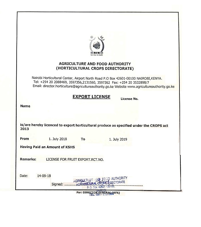 Description: The export permit is valid for 1 financial year and is obtained from KEPHIS in Kenya