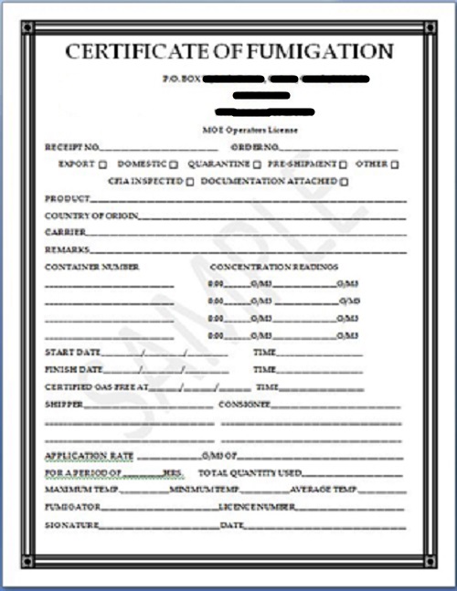Description: This certificate verifies that vehicles and goods for trade have been fumigated to prevent transfer of pests and diseases from one country to another. It is issued by an accredited service provider after undertaking the necessary fumigation process.